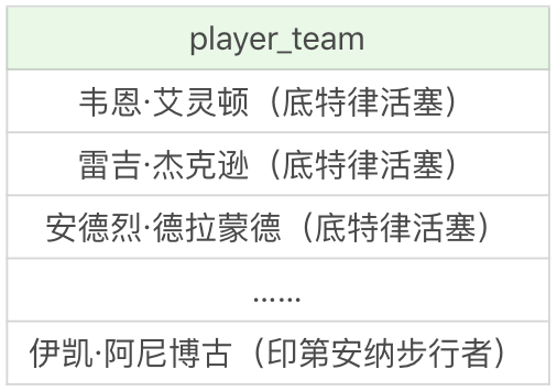 首先我们将player表和team表进行连接,关联条件是相同的team_id。我们想要的格式是player_name(team_name),因此我们使用CONCAT函数,即CONCAT(player_name, '(' , team.team_name , ')'),将player_name字段和team_name字段进行拼接,得到了拼接值被命名为player_team的字段名,将它放到视图player_team中。