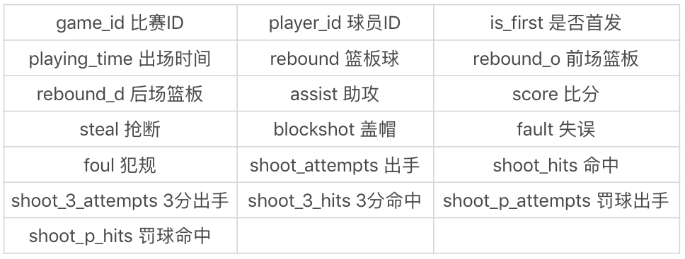 我以球员比赛成绩表为例,对应的是player_score表。这张表中一共有19个字段,它们代表的含义如下: