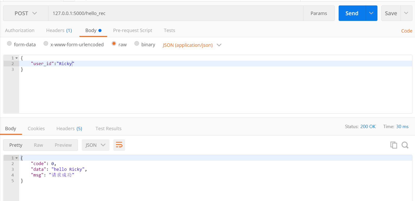 第11行到20行是我们实现这个功能的主体部分。在这里我们定义了一个路由,路由地址为“/hello_rec”,然后指定接收的请求为Post请求。在函数体部分,我使用了一个try函数,当请求的内容有问题时,为了让用户体验更友好,我直接使用jsonify返回一个编码为2000的错误,如果请求的内容是正确的,就去接收请求过来的user_id,然后返回hello加上user_id,最终使用jsonify包装后返回给用户。