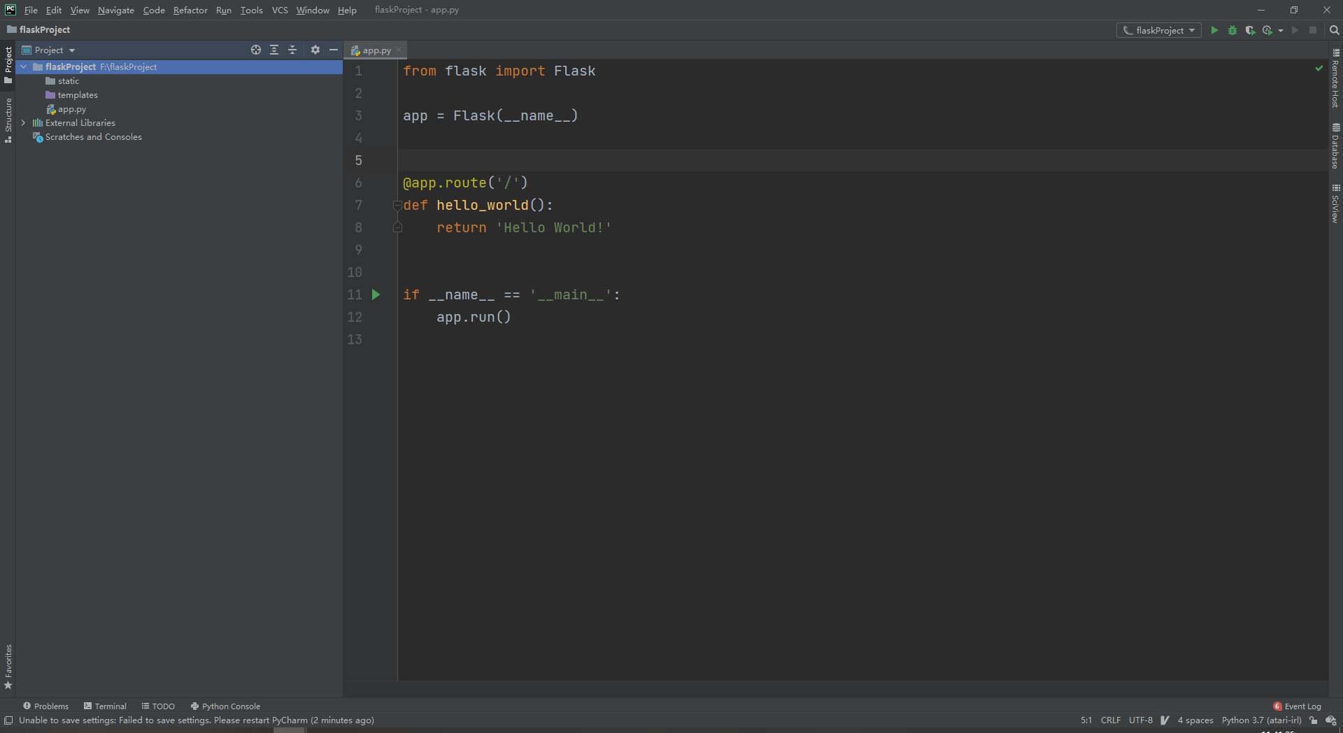不过要注意的是,在我们以往的Python项目中,一个项目的启动文件是main.py文件,但是对于一个Flask工程而言,它的启动文件应该是app.py,这个区别一定要记住。