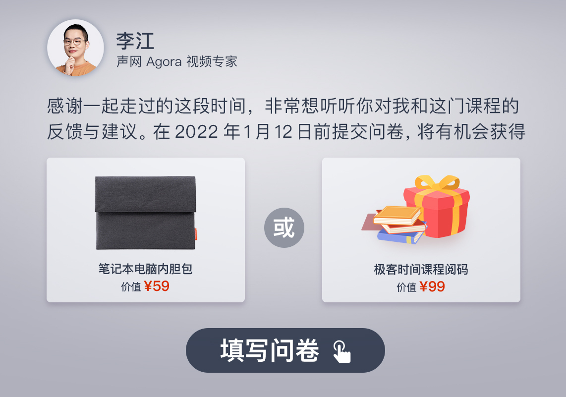 最后,文末有一份结课问卷,希望你可以花两分钟的时间填写一下。我会认真倾听你对这个专栏的意见或建议,期待你的反馈!