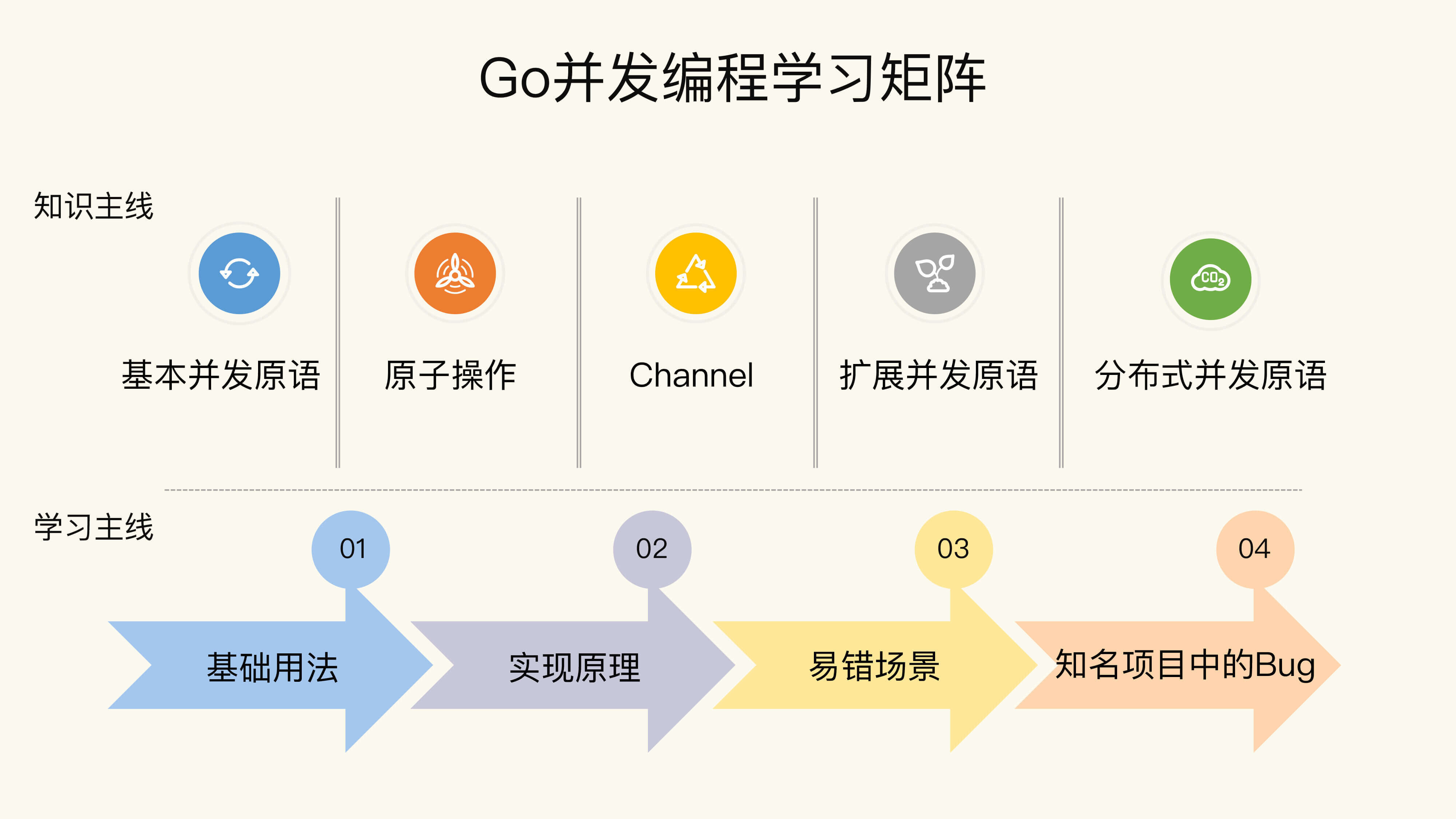 学习这件事儿,最怕的就是不成体系,即使知识点之间是彼此独立的,也必定存在着联系。我们要做的,就是找出逻辑关系,拎出知识线。我认为,关于Go并发编程,有两条主线,分别是知识主线和学习主线。具体是啥意思呢?可以看下面的这张知识地图。