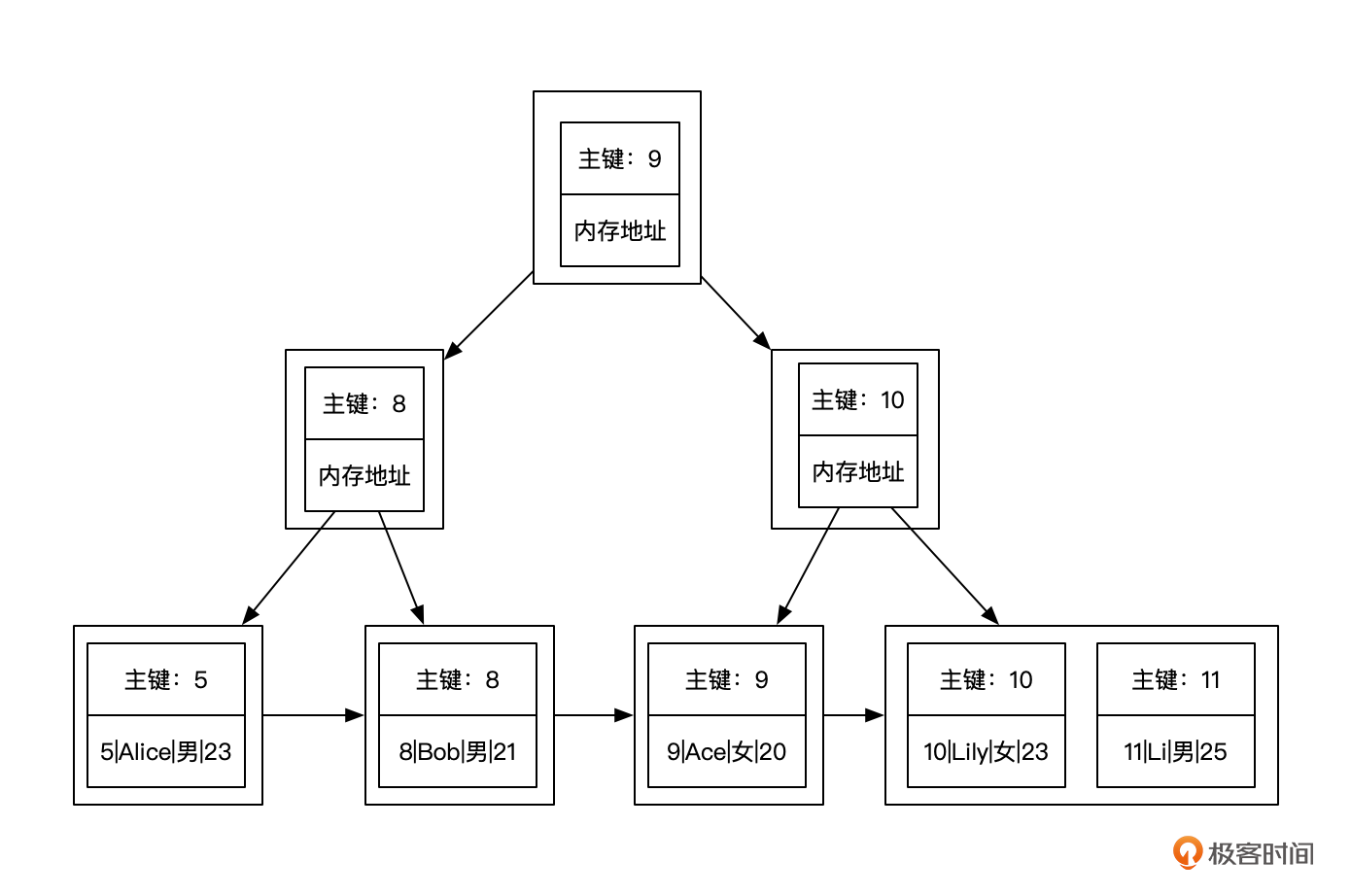 回顾一下,MySQL的主键索引其实是一个基于B+树的聚簇索引,用叶子节点存储了数据。一个用户基本信息表的主键索引就像下面这张图。