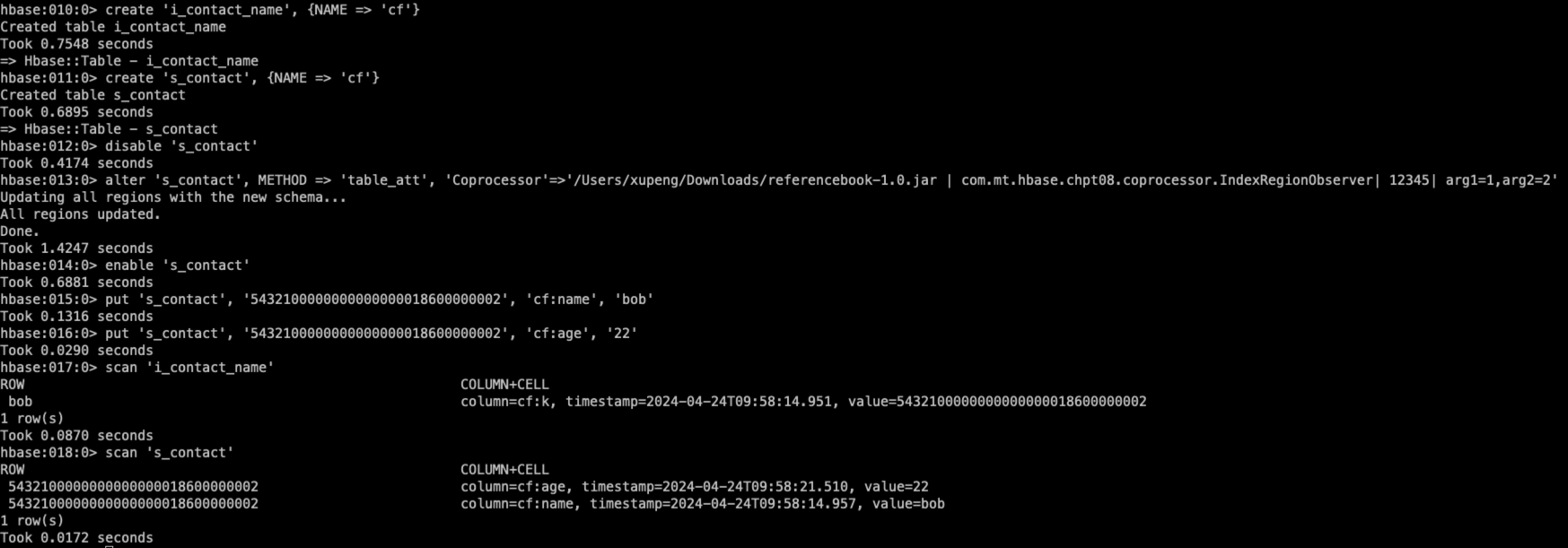 最后一步就是在s_contact表上启用这个协处理器,你可以参考下面的命令。