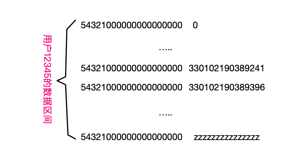 如果知道用户ID,那就满足前缀匹配,可以将全表扫描优化为区间扫描。也就是可以根据用户ID确定一个区间。下面这个图,描述了这样的一个区间。