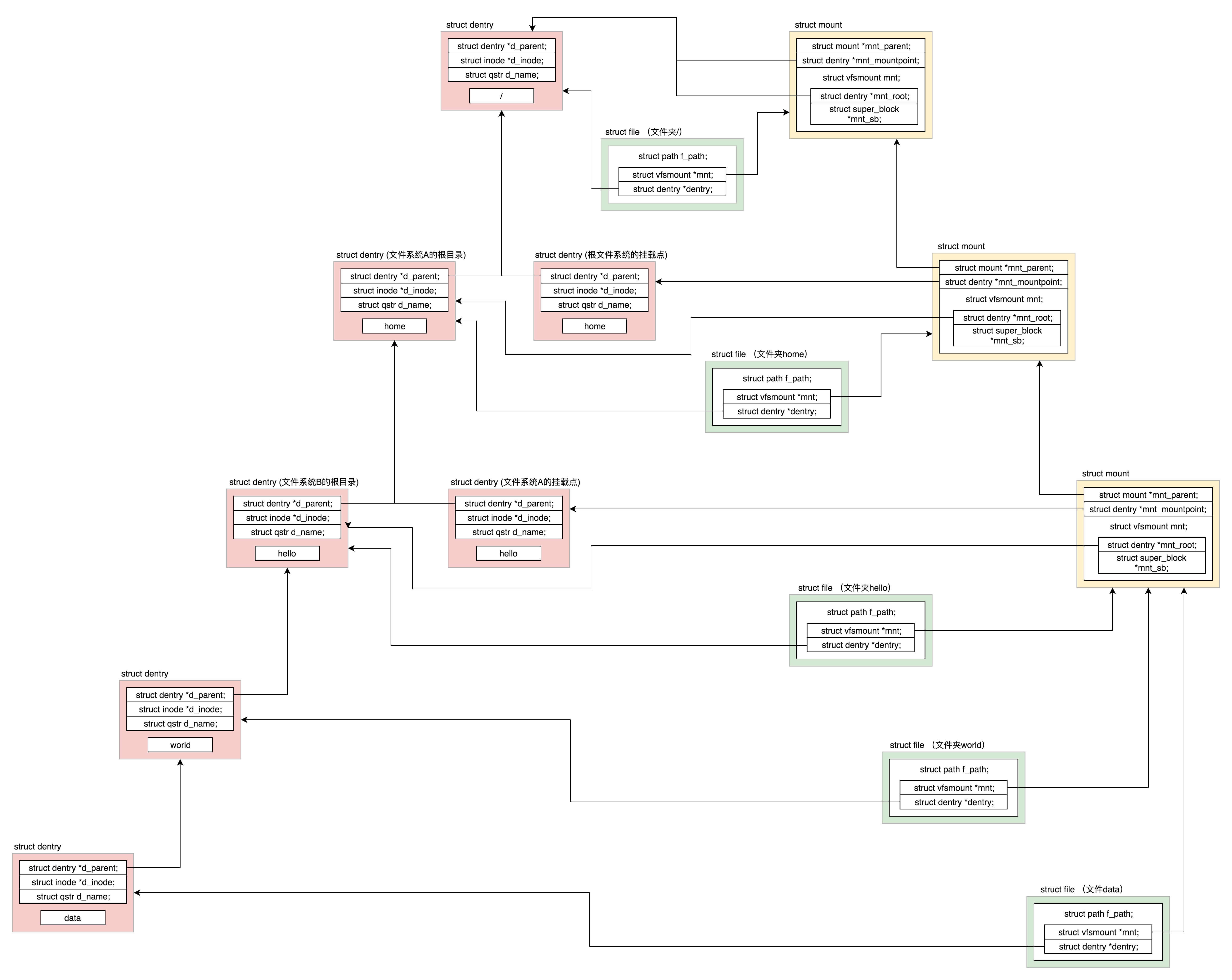 因为还有一次挂载,因而又有了一个mount结构。这个mount结构的mount point指针指向作为挂载点的那个dentry。mount root指针指向作为根目录的那个dentry,同时parent指针指向第一层的mount结构。home对应的file的两个指针,一个指向文件系统A根目录的dentry,一个指向文件系统A的挂载结构mount。
