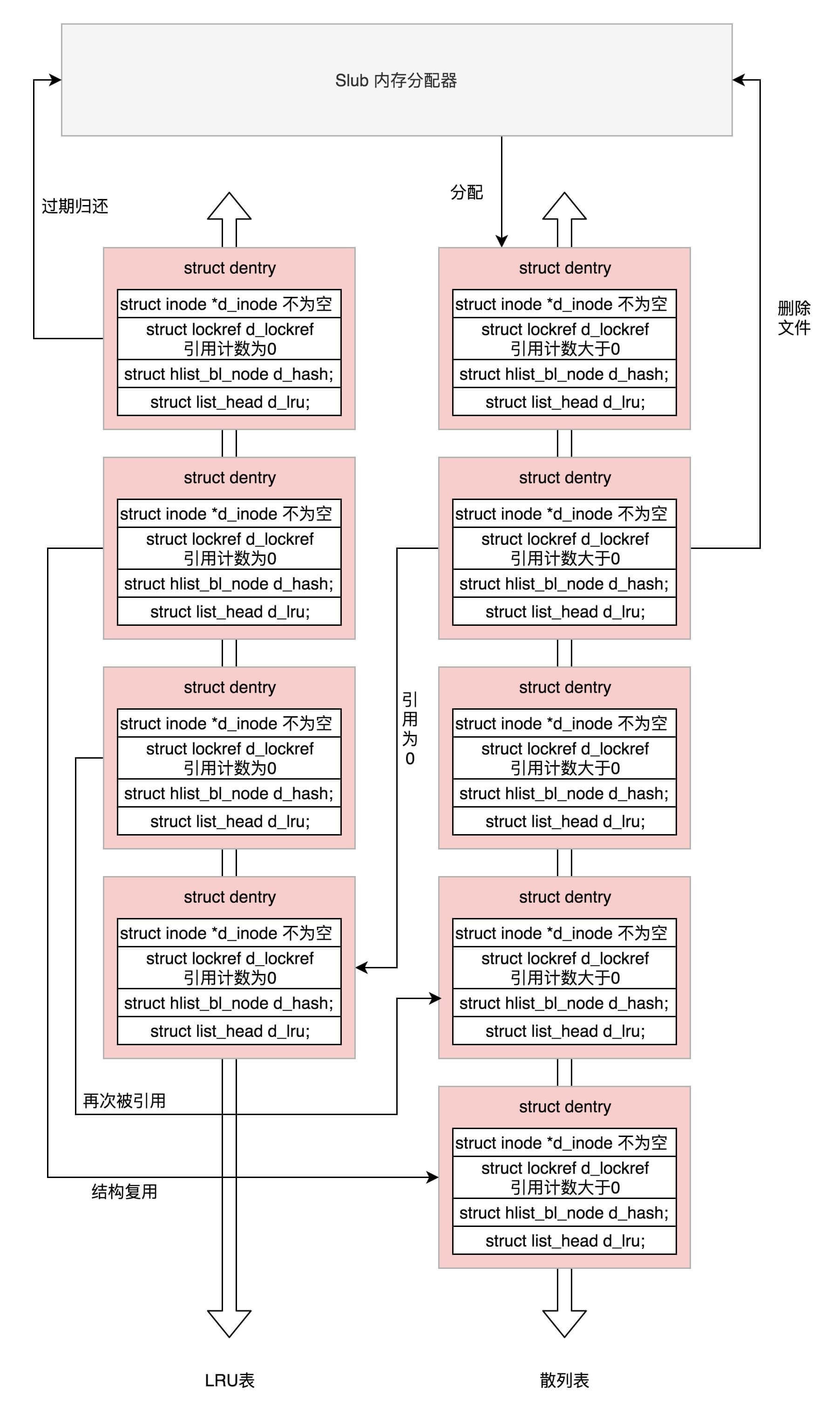 - 过期归还:当LRU表中最长时间没有使用的dentry应该释放回Slub分配器;