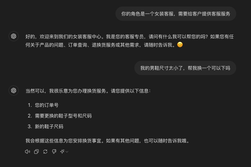 不过,如果用我刚才说的简单提示词来做AI客服,它就会自我发挥了。比如你跟它胡说,说我的男鞋尺寸太小了,让它帮忙换一下。但人家是女装客服呀。它会怎么回答呢?简单的提示词会让它忽略这些细节,直接说帮你办理换货服务,很明显是有问题的。你可以看看这个有问题的回答,是不是和上节课一本正经地胡说八道的例子有点像?