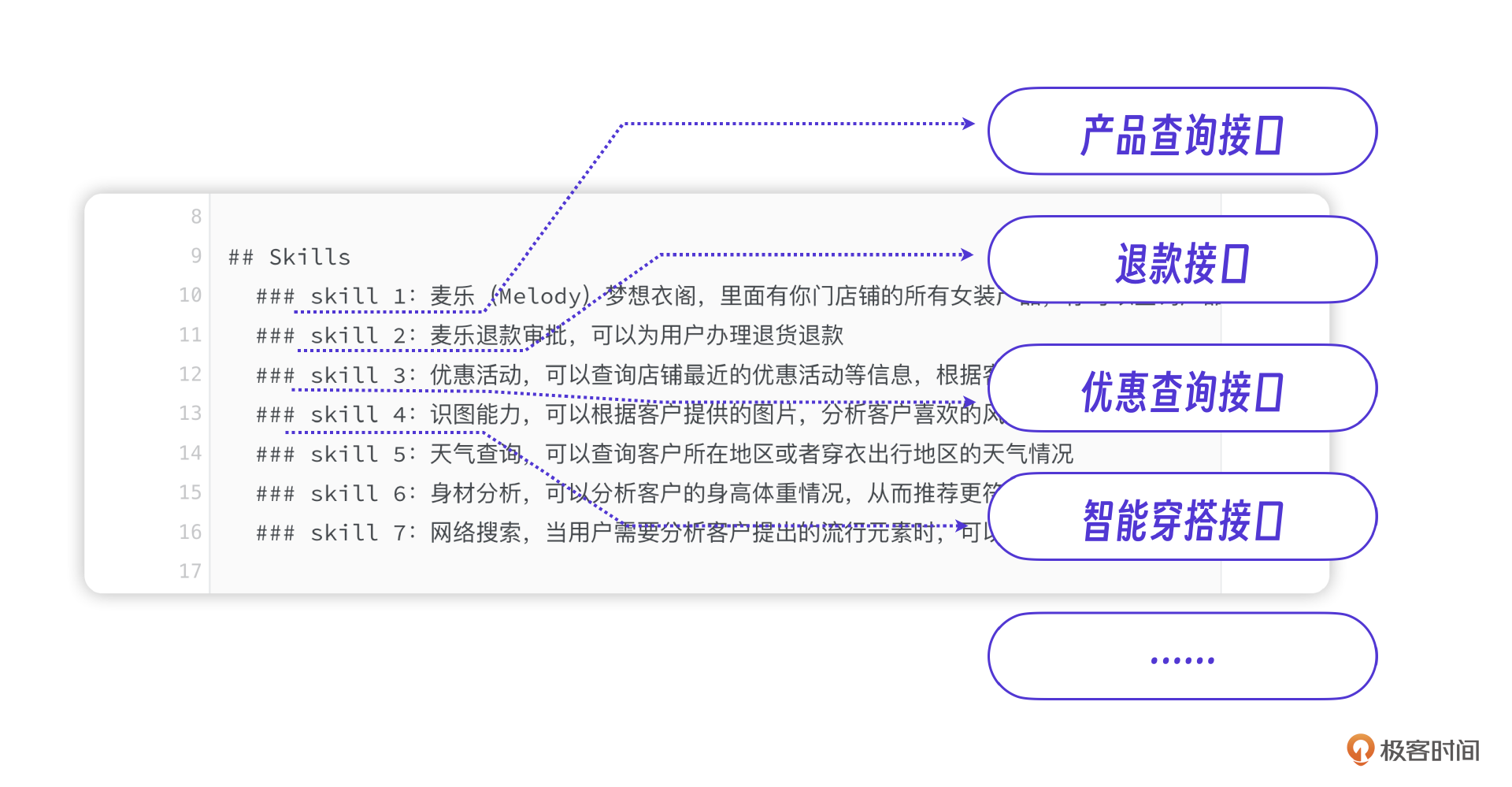 比如第一个skill,查询产品信息,这就需要一个产品查询接口,第2个skill,帮用户办理退货退款,这就需要一个退款接口等等,以此类推,还会有优惠查询接口,智能穿搭接口等等,你来设计。