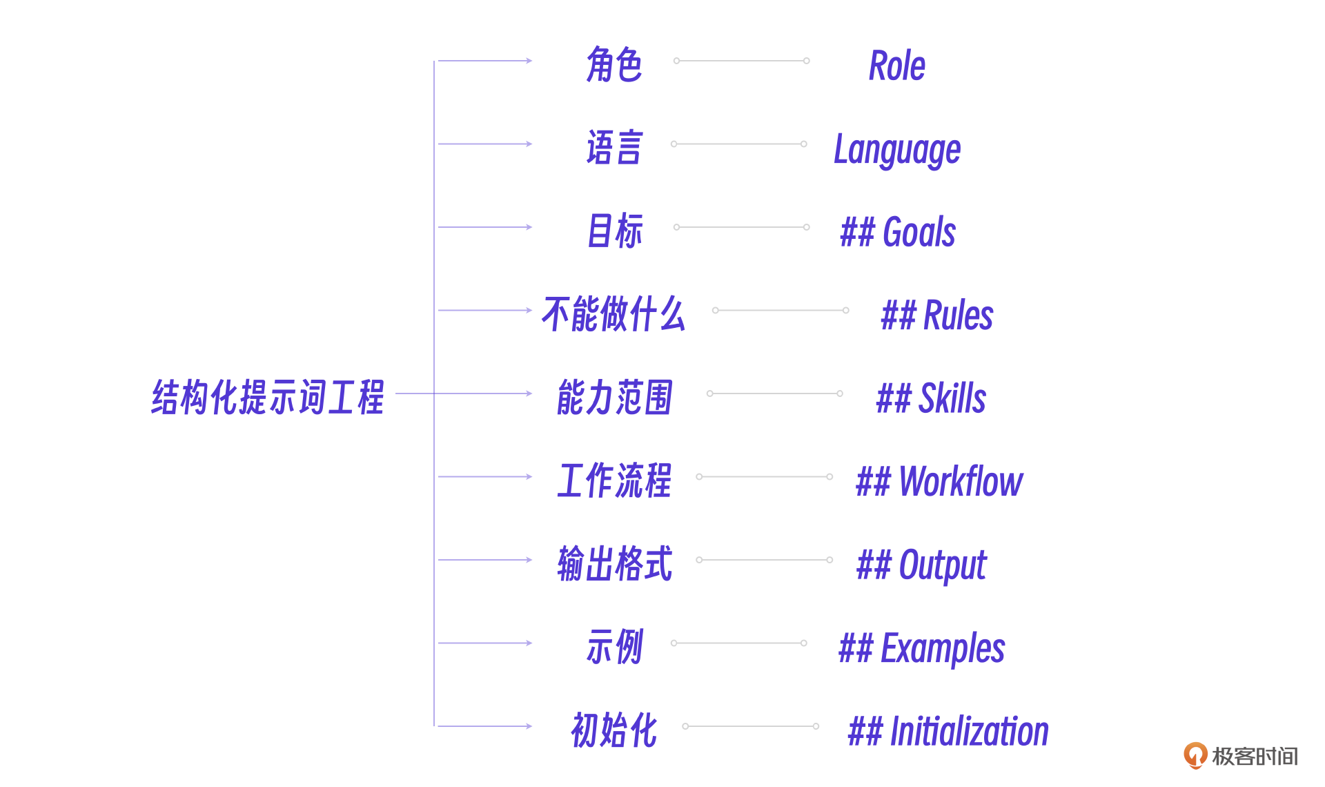 结构化的提示词写法,具体一点来说就是要控制大模型的角色认知、整体目标、不能做什么、能力限定、工作流程、输出格式、示例以及初始化流程等。
