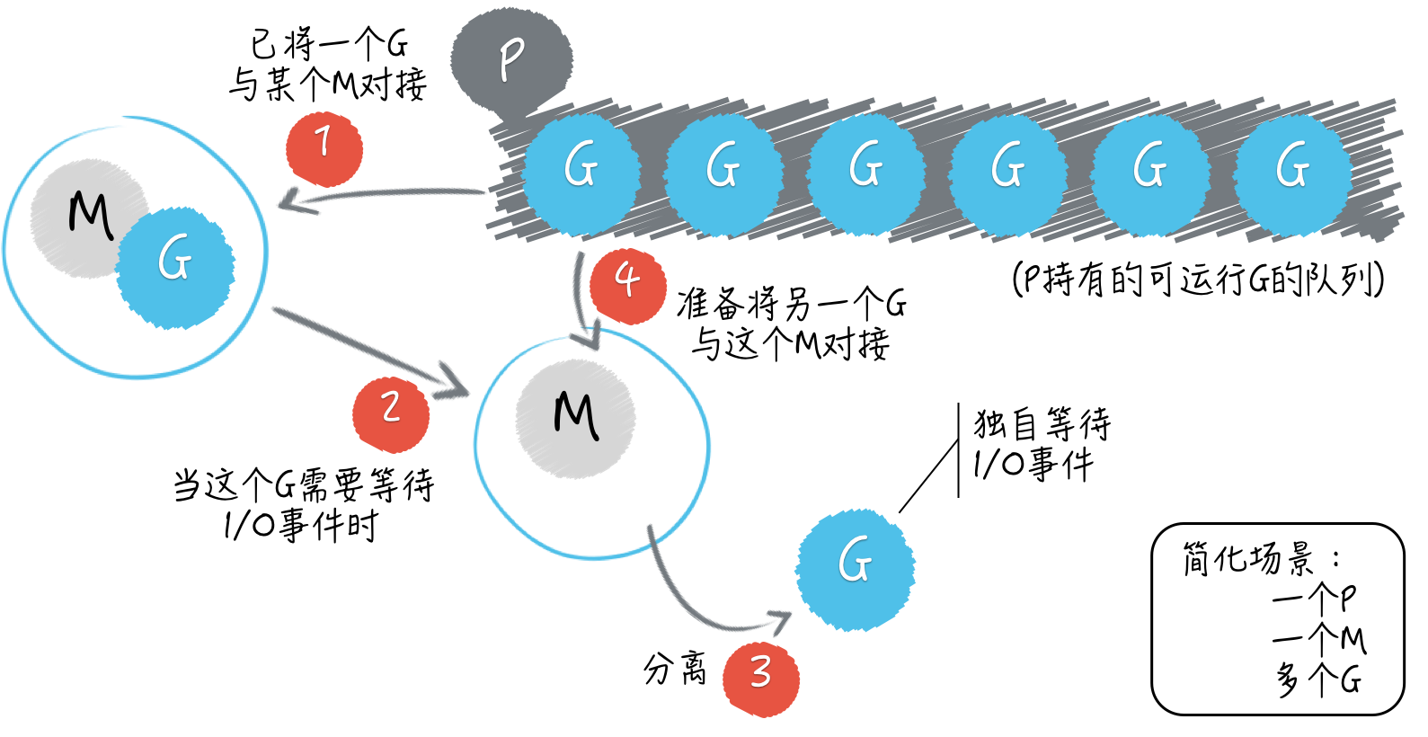 从宏观上说,G和M由于P的存在可以呈现出多对多的关系。当一个正在与某个M对接并运行着的G,需要因某个事件(比如等待I/O或锁的解除)而暂停运行的时候,调度器总会及时地发现,并把这个G与那个M分离开,以释放计算资源供那些等待运行的G使用。