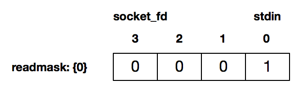 接下来的16-51行是循环检测,这里我们没有阻塞在fgets或read调用,而是通过select来检测套接字描述字有数据可读,或者标准输入有数据可读。比如,当用户通过标准输入使得标准输入描述符可读时,返回的readmask的值为: