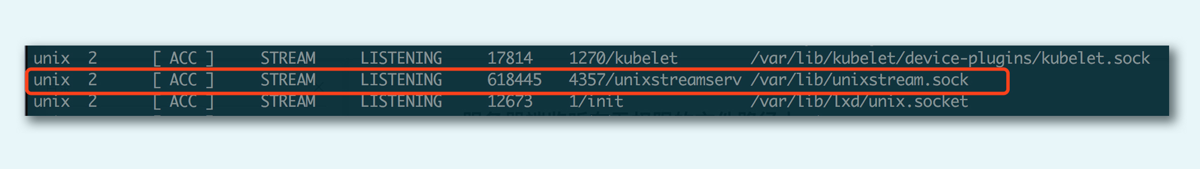 如果我们使用netstat命令查看UNIX域套接字,就会发现unixstreamserver这个进程,监听在/var/lib/unixstream.sock这个文件路径上。