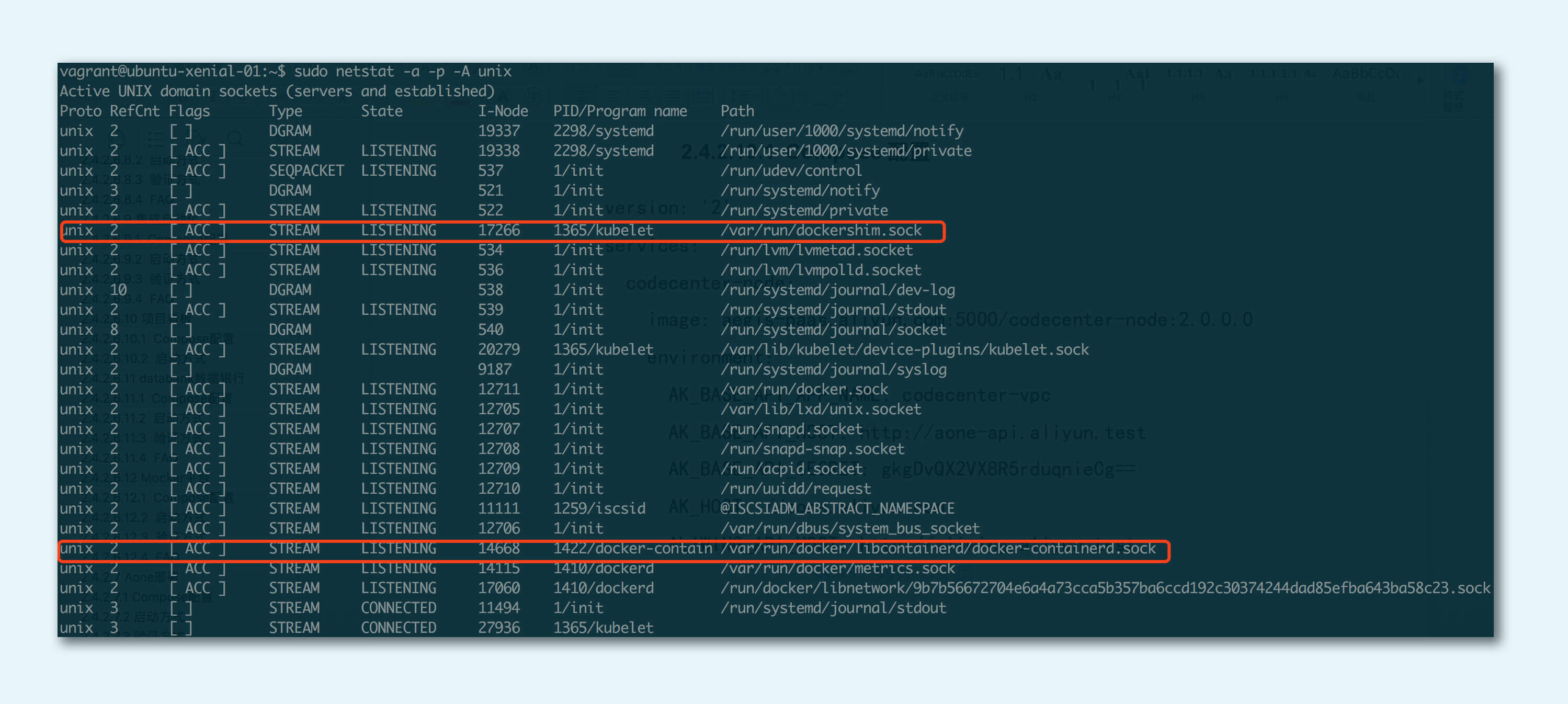 我们可以通过netstat命令查看Linux系统内的本地套接字状况,下面这张图列出了路径为/var/run/dockershim.socket的stream类型的本地套接字,可以清楚地看到开启这个套接字的进程为kubelet。kubelet是Kubernetes的一个组件,这个组件负责将控制器和调度器的命令转化为单机上的容器实例。为了实现和容器运行时的解耦,kubelet设计了基于本地套接字的客户端-服务器GRPC调用。