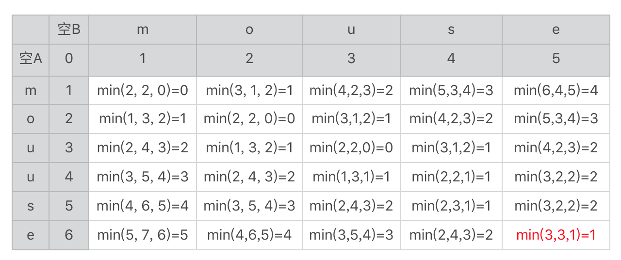 这里面求最小值的min函数里有三个参数,分别对应我们上节讲的三种情况的编辑距离,分别是:A串插入、B串插入(A串删除)和替换字符。在表格的右下角我标出了两个字符串的编辑距离1。