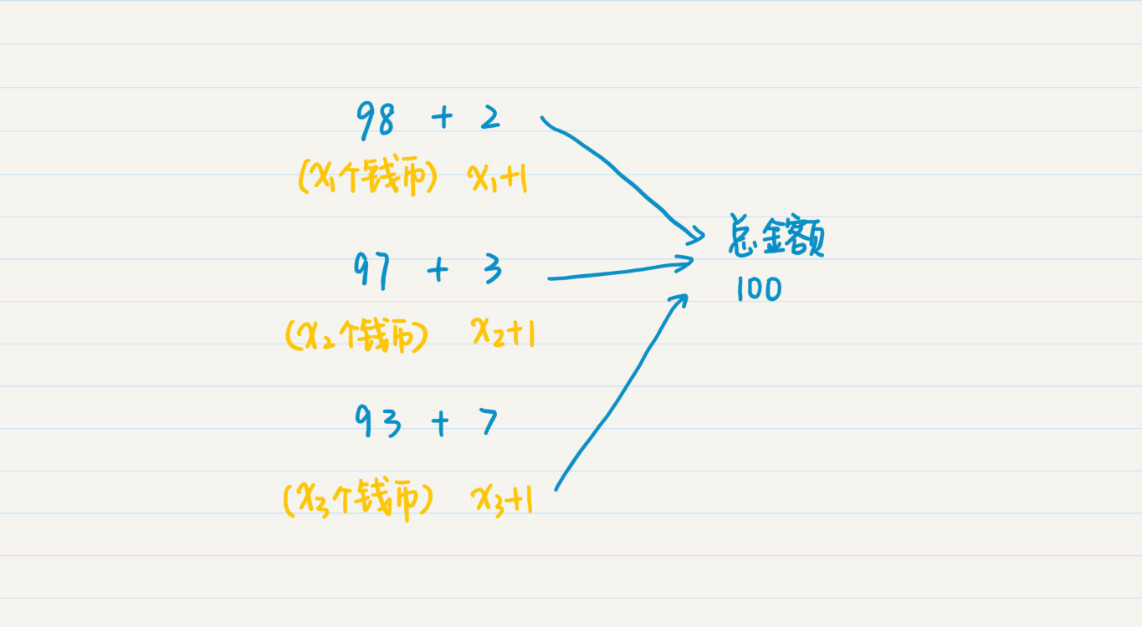 第一种,总和98元的钱币,加上1枚2元的钱币。如果凑到98元的最少币数是$x_{1}$,那么增加一枚2元后就是($x_{1}$ + 1)枚。