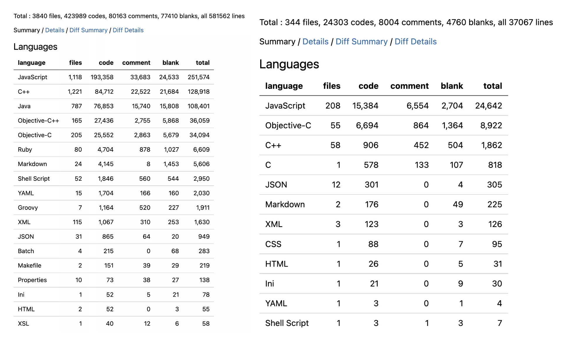 我用 VS Code Counter 统计了 React Native 0.70 版本的代码明细和React Native 2015年1月30日开源的第一版代码统计明细,你可以看下其中的差异: