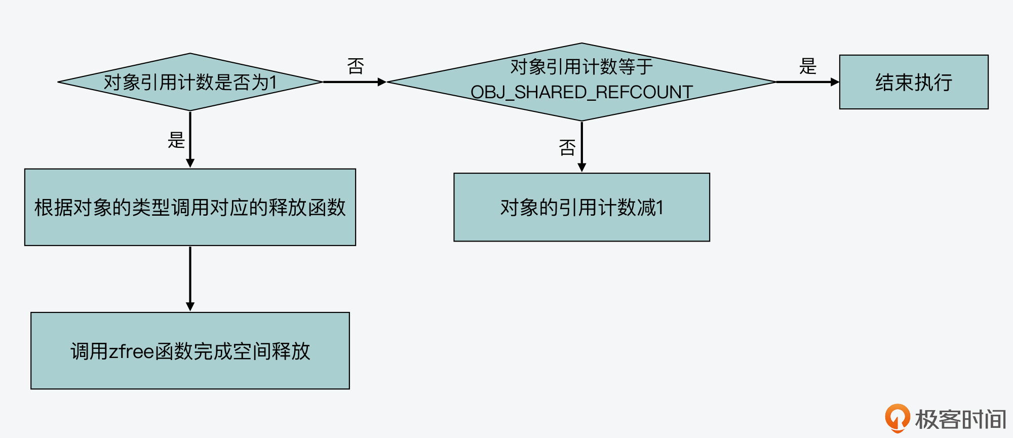 那么在这里,你要知道的是,**decrRefCount函数在执行时,会判断待释放对象的引用计数。**只有当引用计数为1了,它才会根据待释放对象的类型,调用具体类型的释放函数来释放内存空间。否则的话,decrRefCount函数就只是把待释放对象的引用计数减1。