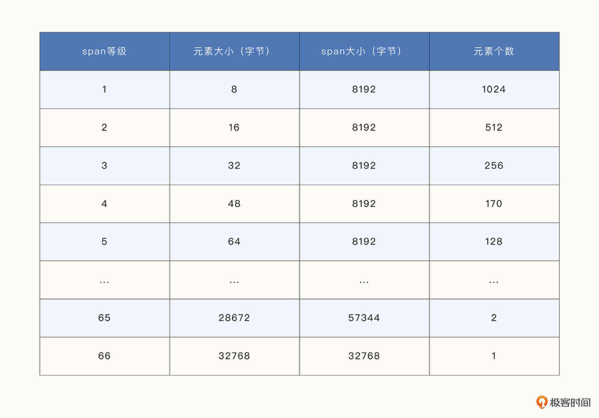 每个 span 的大小和 span 中元素的个数都不是固定的。例如第 1 级 span 中的元素大小为 8 字节,span大小为8192字节,所以第1级 span 拥有的元素个数为8192/8 = 1024个。第65级span的大小为57344 字节,每个元素的大小为 28672 字节,元素个数为2。
