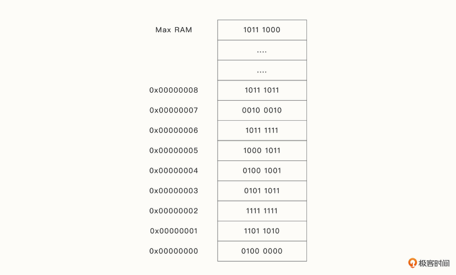 不管数据在物理内存的哪里,RAM几乎都允许在相同的时间内读取或写入数据。我们可以将物理内存视为下面这样的单元阵列,每一个单元可容纳8位的信息。每个内存单元都有一个地址,CPU可以通过寻址读取或者写入特定地址的数据。