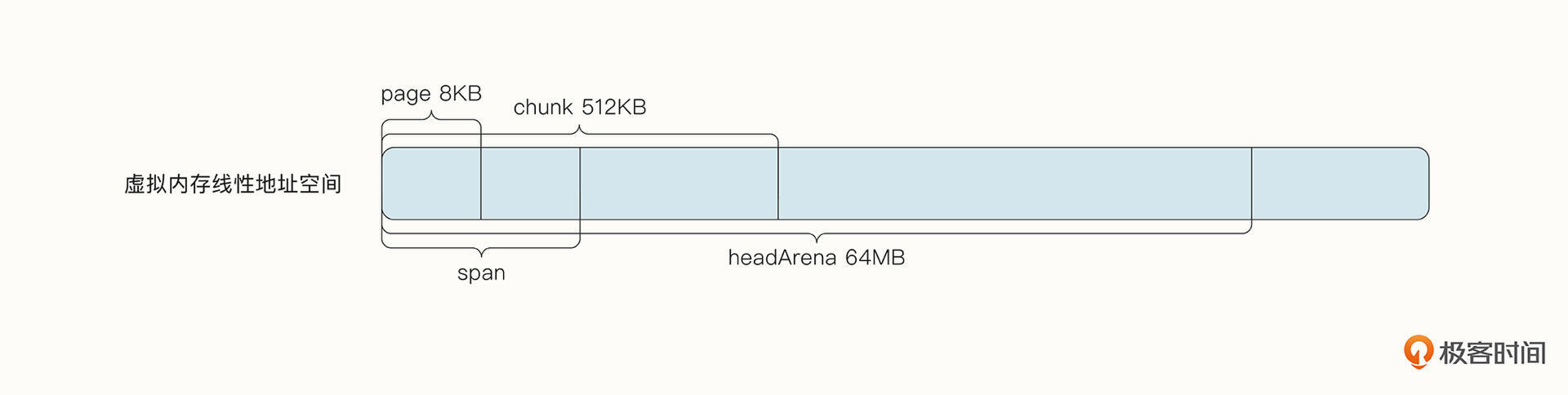 根据对象的大小,Go 语言将堆内存分成了heapArena、chunk、span 与page 4种内存块进行管理。其中,heapArena 内存块最大,在Unix 64 位操作系统中占据了64MB。chunk 占据了512KB,span 根据级别大小的不同而不同,但必须是page的倍数,而 1 个page 占据8KB。不同的内存块用于不同的场景,便于我们高效地对内存进行管理。