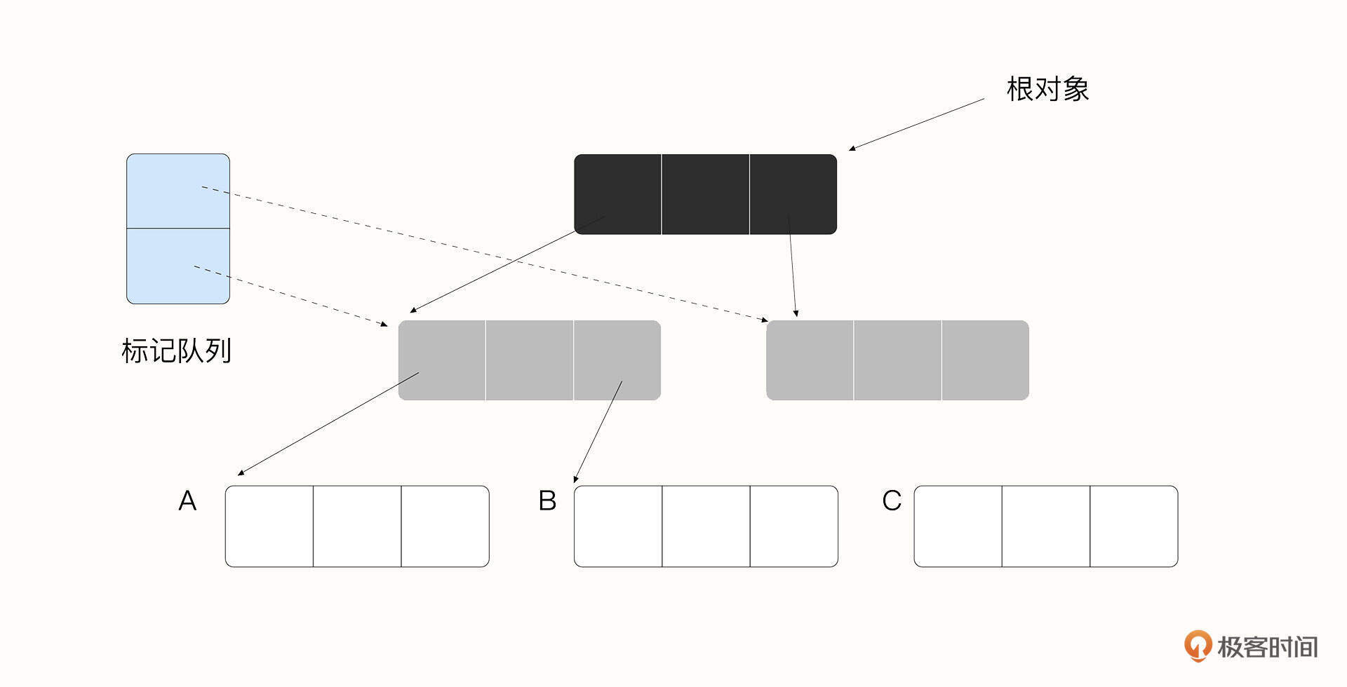 在标记阶段,我们要将对象标记为黑色、灰色、白色三种类型。其中黑色代表已经被扫描了;灰色对象已经被黑色对象所引用,但是暂时还没有被扫描,被扫描之后会转换为黑色;白色也暂时没有被扫描,但是它内部可能有垃圾对象,如果之后被灰色对象扫描到,则会转为灰色。