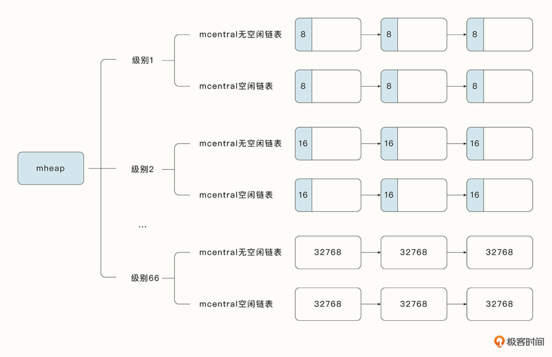 - 微小对象会被放入class 为2 的span 中的某一个元素中。如果当前要分配的元素空间不够,运行时将尝试从 mcache 中查找 span 中下一个可用的元素。