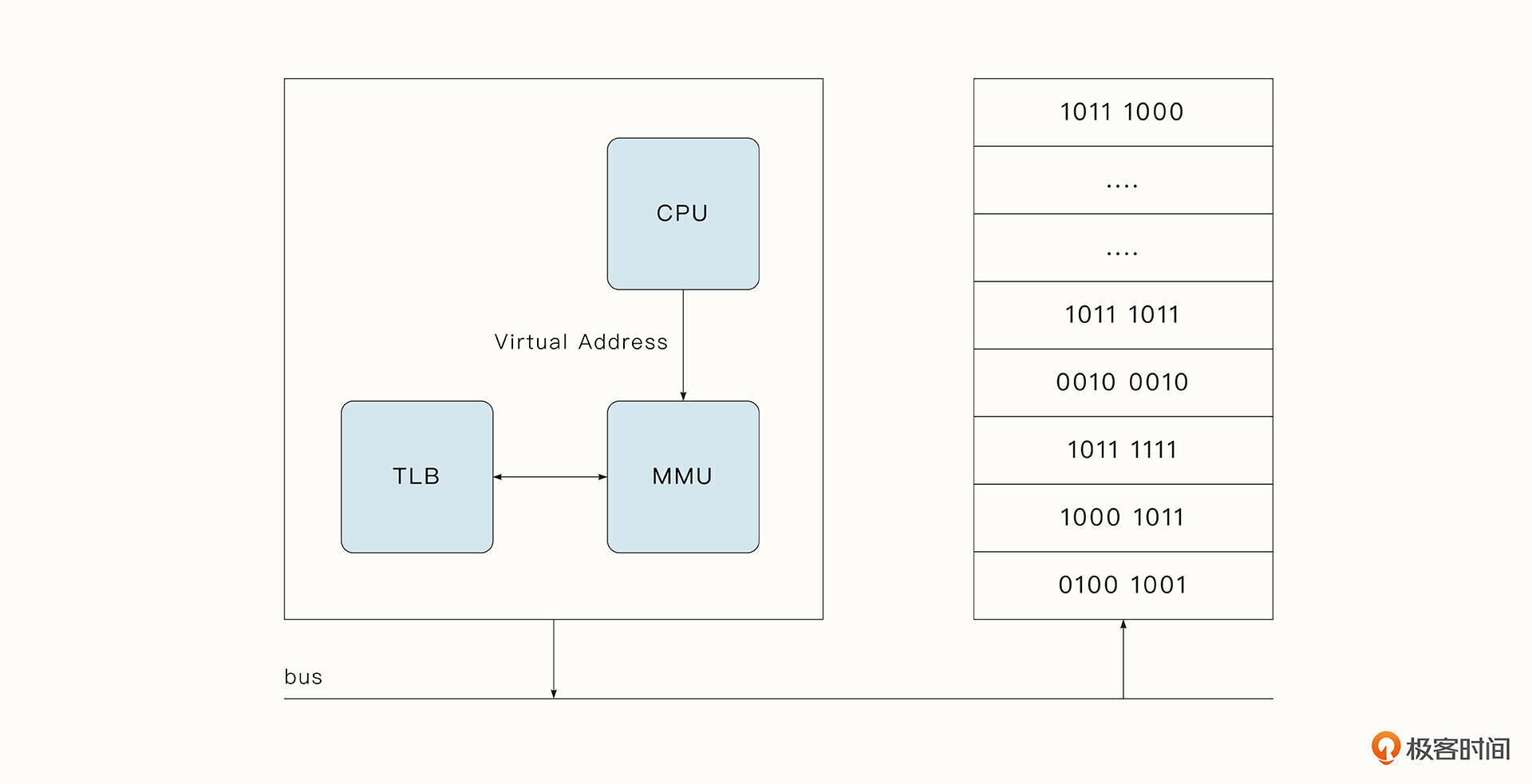 为了实现虚拟内存,我们需要一种叫做内存管理单元(MMU)的芯片,它一般集成在CPU芯片内部。MMU将虚拟内存地址到物理内存地址的映射保存在页表(page table)中。MMU还有叫做 TLB(Translation Lookaside Buffer)的物理缓存,负责存储从虚拟内存到物理内存最新的转换,加快转换的速度。