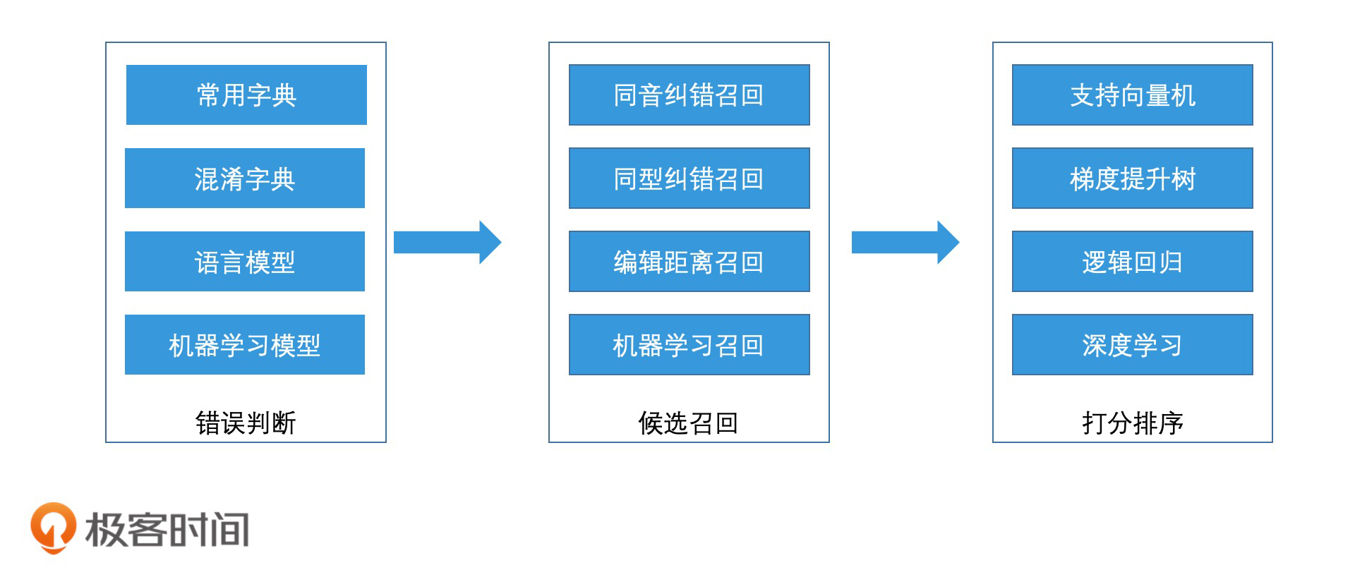 最后,我们要对众多的纠错结果进行打分排序。在这个过程中,我们可以使用各种常见的机器学习和深度学习算法进行打分判断(你可以回忆一下11讲,我们讲过的那些方法),将得分最高的纠错结果返回。这样就完成了整个查询纠错过程。