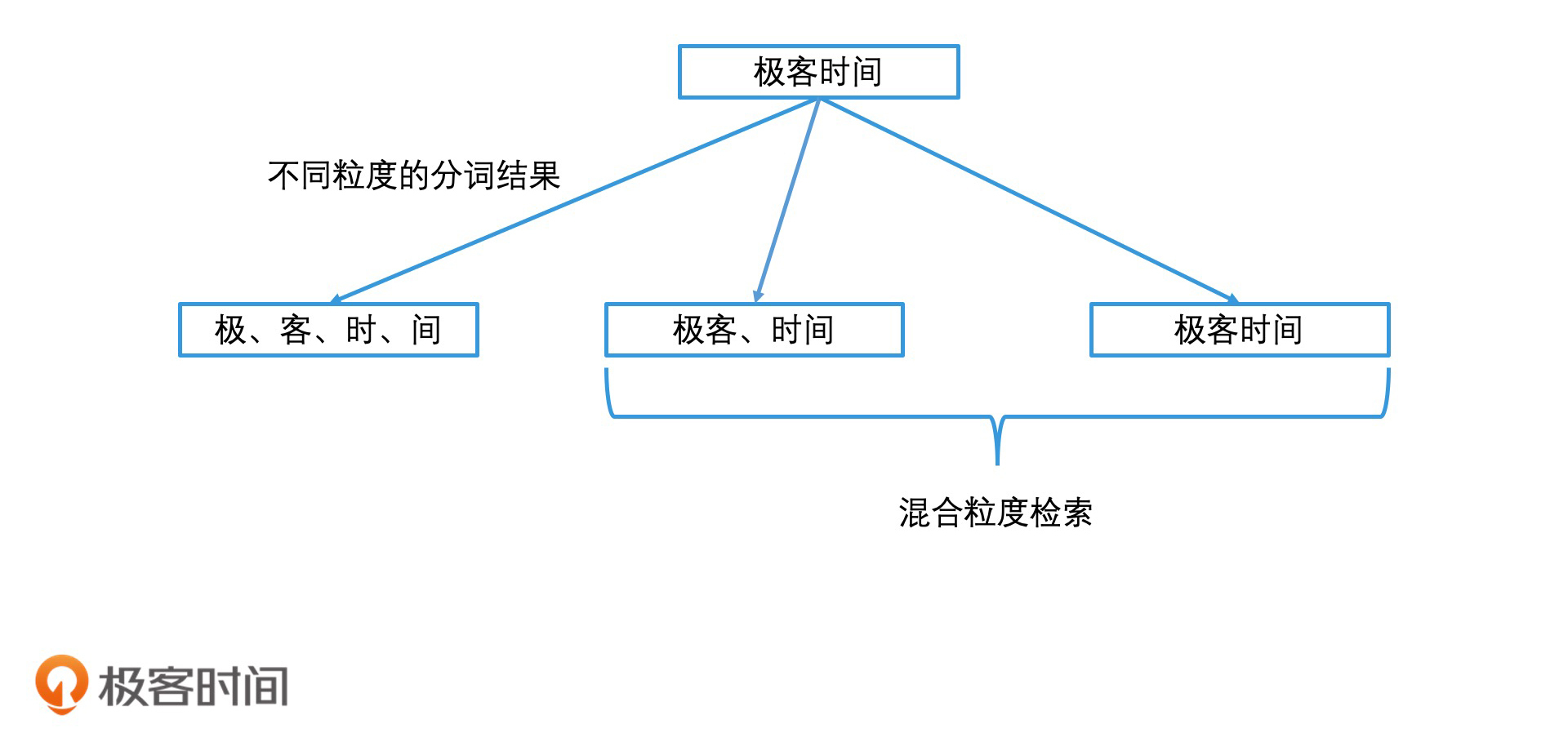 一般来说,我们会使用默认的标准分词粒度再结合整个短语,作为我们的检索关键词去倒排索引中检索,这就叫作混合粒度的分词方式。那“极客时间”就会被分为【极客、时间、极客时间】这样的检索词组合。如果检索后返回的结果数量不足,那我们还会去查询【极、客、时、间】这样的更细粒度的单字组合。