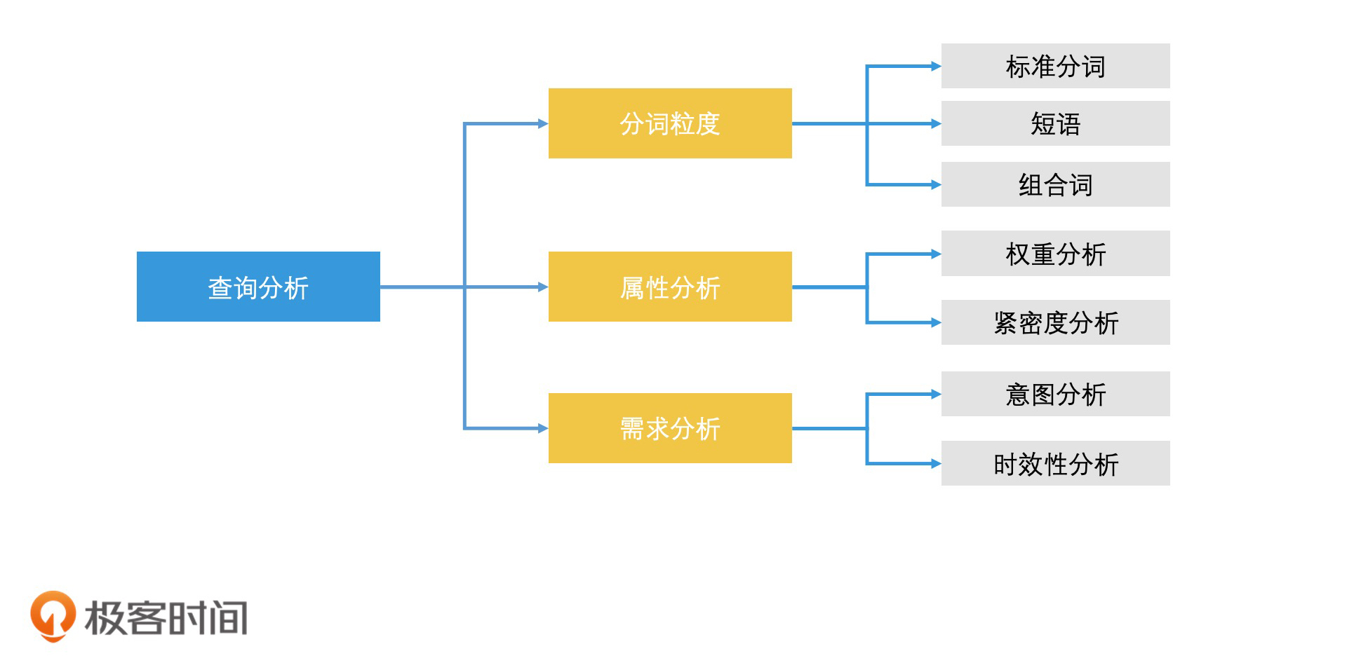 比如说,当用户输入“极客时间”时:如果我们按单字来切分,这个搜索词就会变成“极/客/时/间”这四个检索词;如果是按“极客/时间”来切分,就会变成两个检索词的组合;如果是不做任何分词,将“极客时间”当成一个整体,那就是一个搜索短语。切分的方式这么多,到底我们该怎么选择呢?