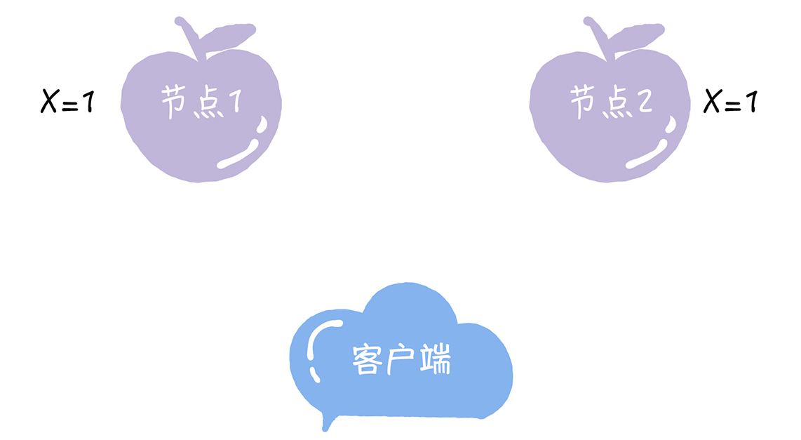如果节点1收到写请求后,通过节点间的通讯,同时将节点1和节点2的X值都更新为2,然后返回成功给客户端。