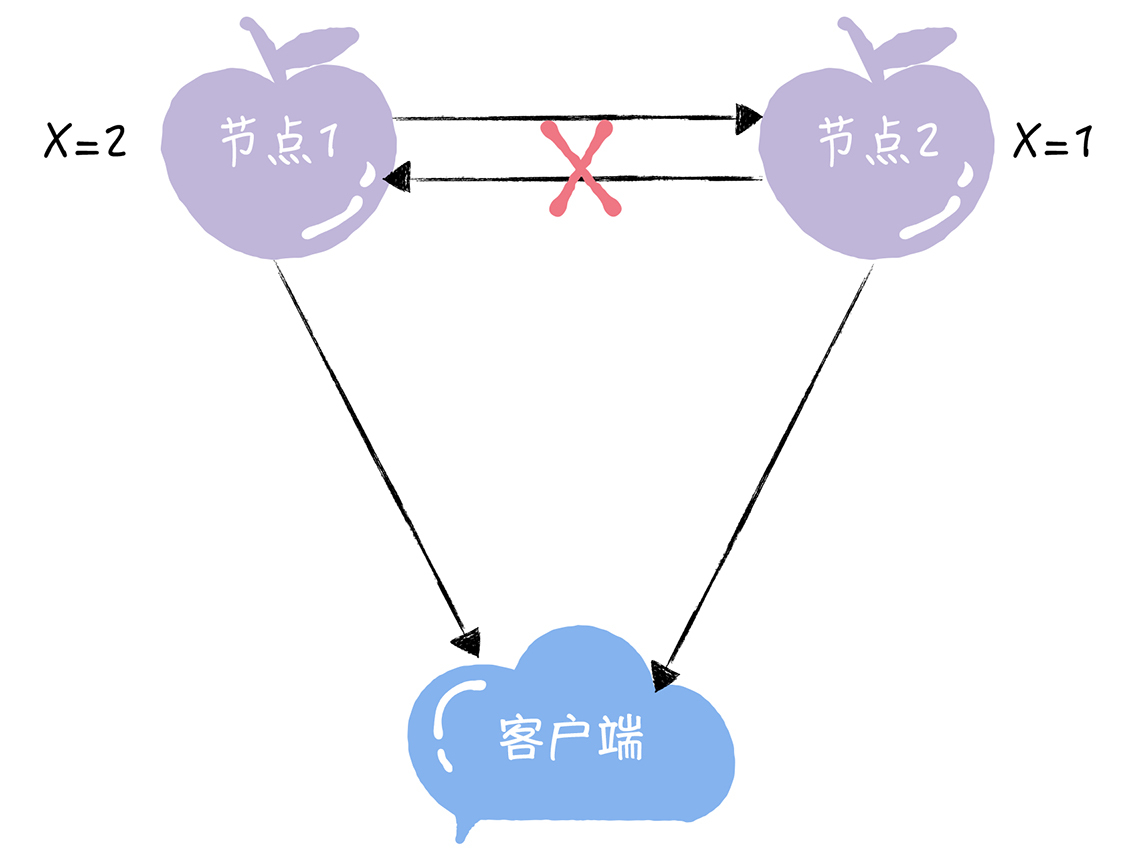 那么,此时如果客户端访问节点2执行读操作,就无法读到最新写入的X值,这就不满足一致性了。