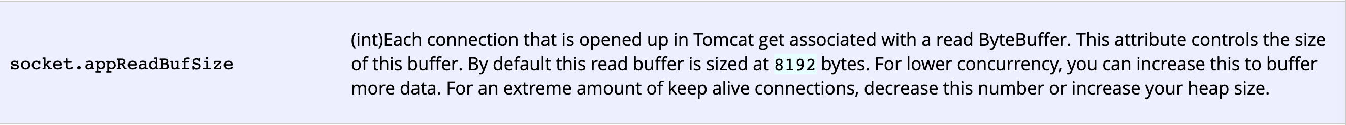 在Tomcat文档中有提到,这个Socket的读缓冲,也就是readBuffer默认是8192字节。显然,问题出在了headerBufferSize上: