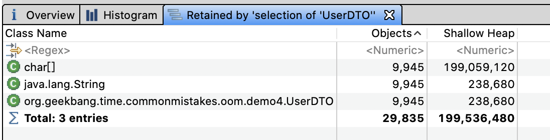 再次分析堆内存,可以看到UserDTO只有9945份,总共占用的内存不到200M。这才是我们真正想要的结果。