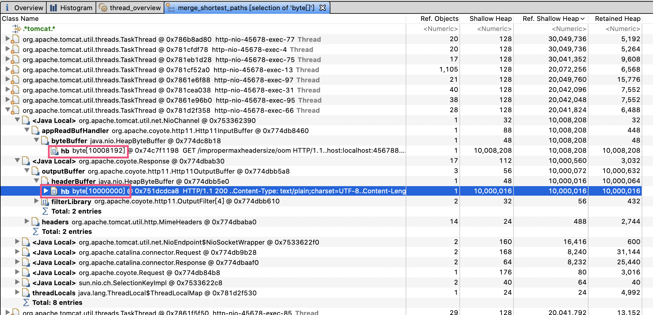 通过查看引用可以发现,大量引用都是Tomcat的工作线程。大部分工作线程都分配了两个10M左右的数组,100个左右工作线程吃满了内存。第一个红框是Http11InputBuffer,其buffer大小是10008192字节;而第二个红框的Http11OutputBuffer的buffer,正好占用10000000字节: