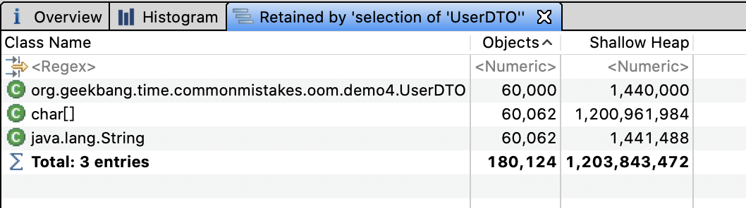使用内存分析工具MAT打开堆dump发现,6万个UserDTO占用了约1.2GB的内存:
