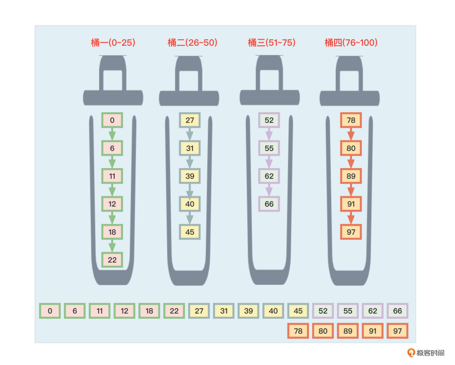 上面这组数据的范围在0100之间,所以可以把这个区间划分成4个(该数字比较随意)大小相同的子区间(4个桶):025、2650、5175、76~100。然后把这些待排序的数据根据自身大小放入对应的桶中。如图7所示。