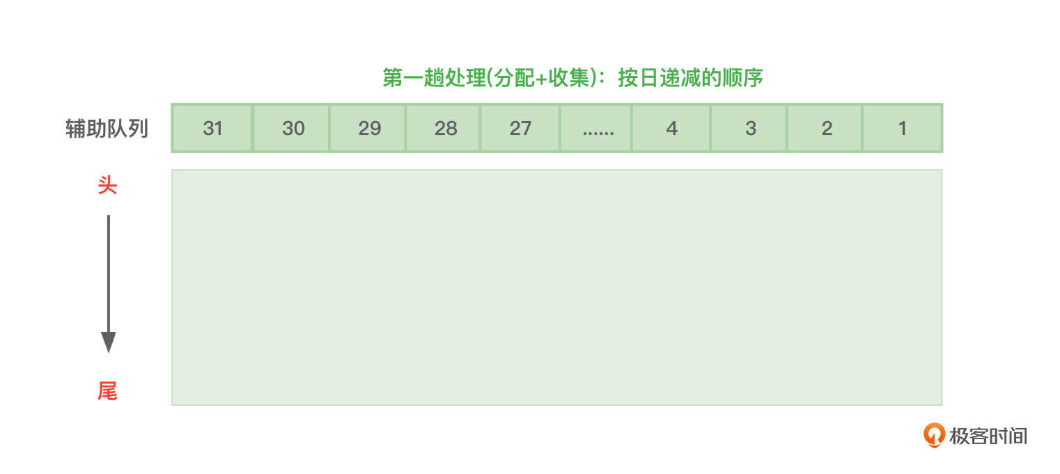 - k是每趟排序用到的辅助队列大小,第一趟是31,第二趟是12,第三趟是21,这里按最大值31计算。