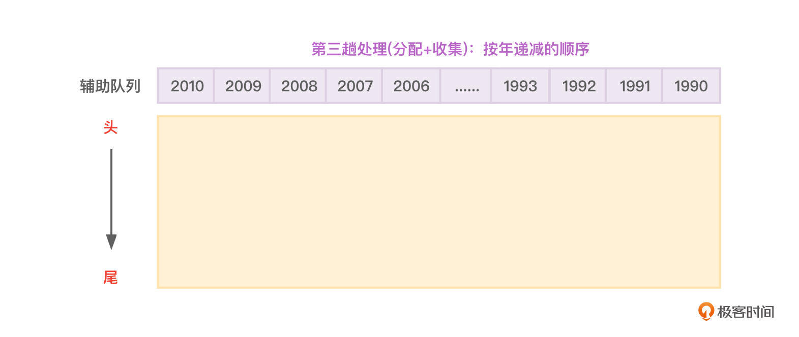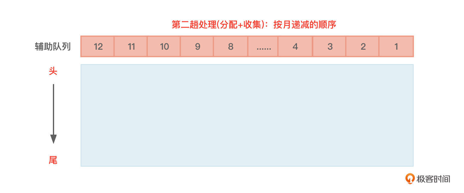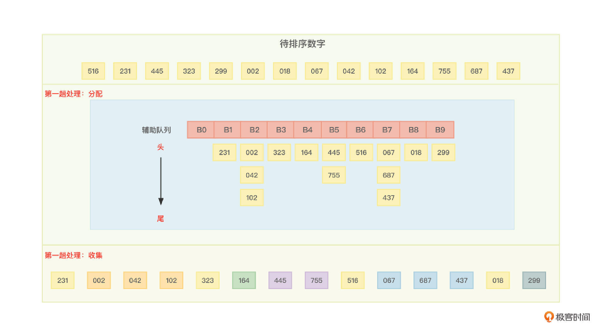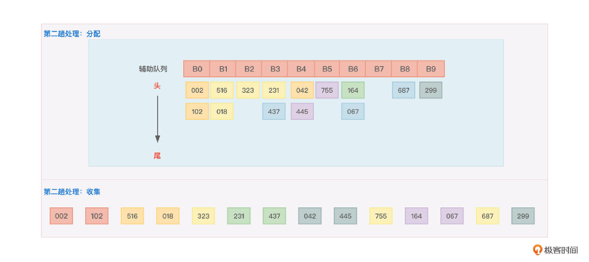 基数排序要进行多趟排序,每趟排序都要经历“分配”和“收集”两个步骤,当然,每趟排序也都会基于上一趟排序的成果再次排序。