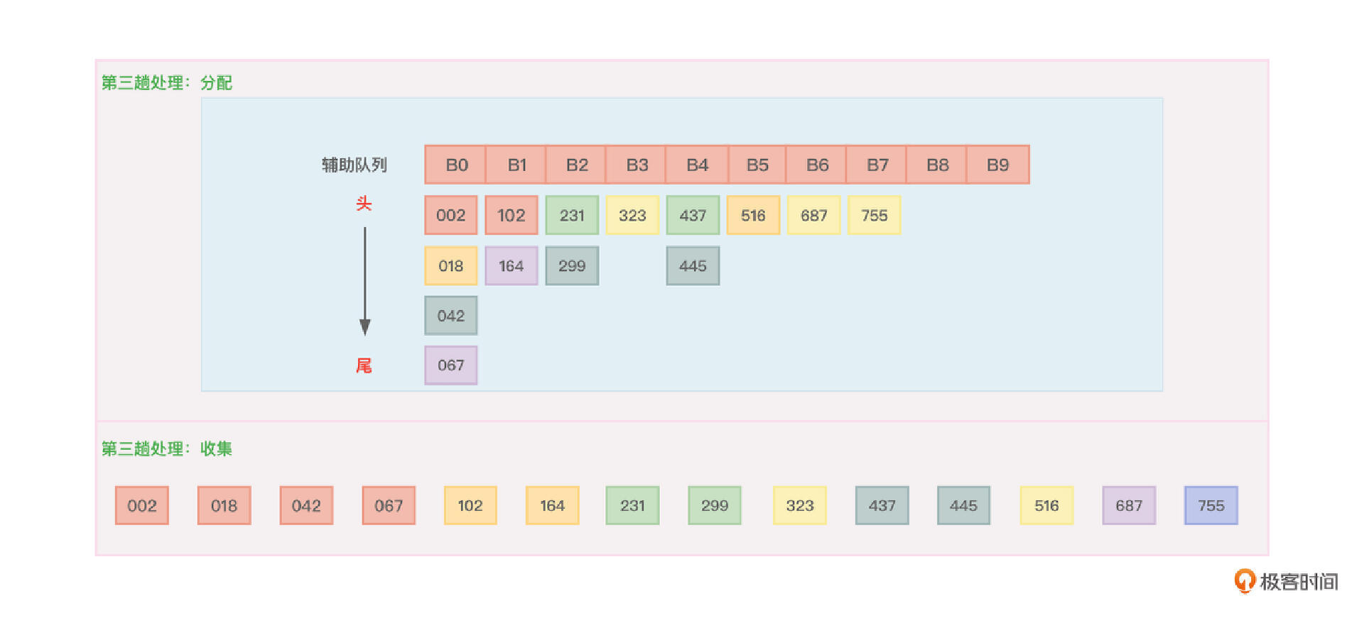 - 收集:依次从B0~B9辅助队列中把相关的数字从上到下、从左到右收集并排列起来。