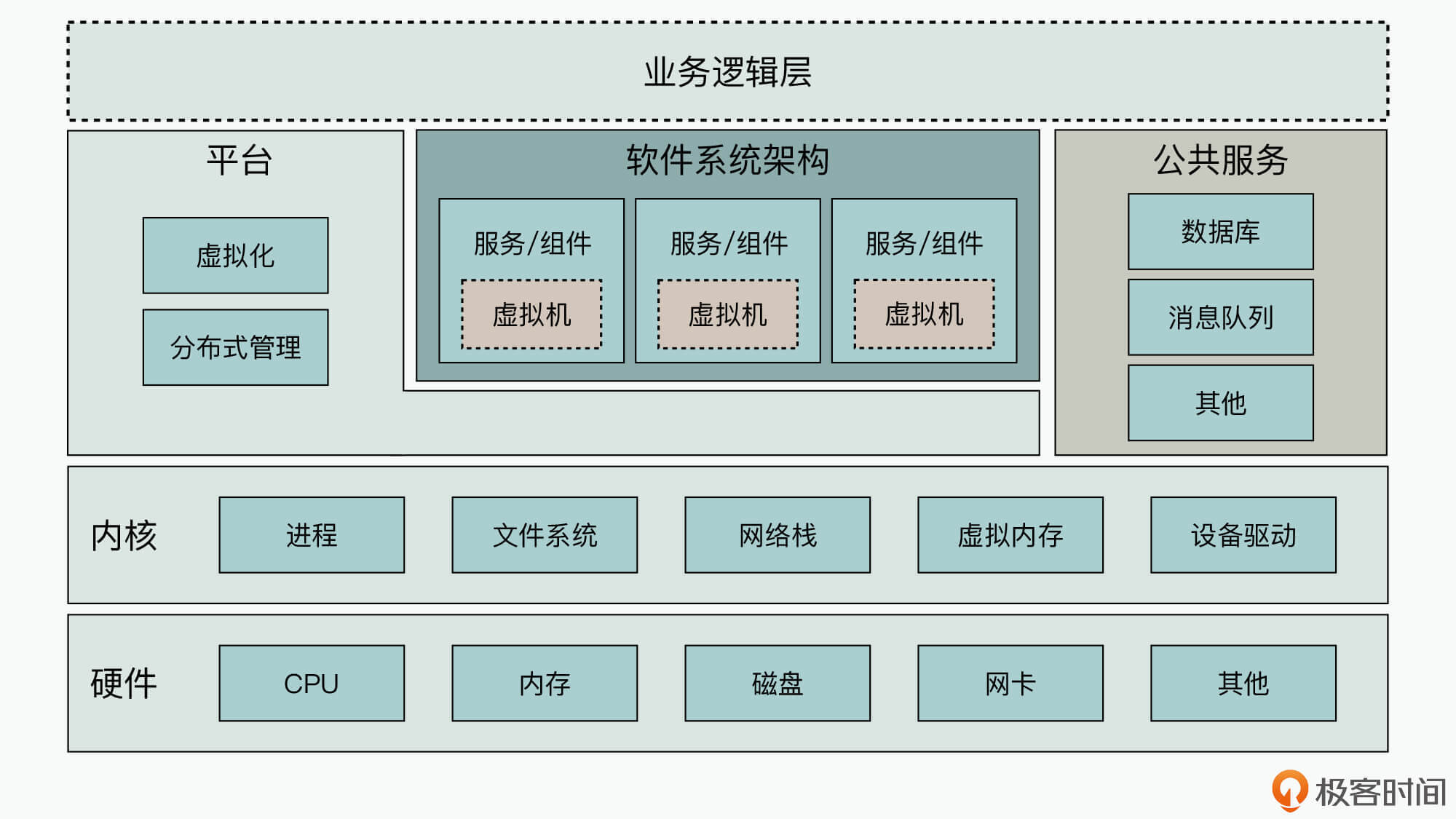 可是要想实现以上目标,就需要我们对软件系统的性能监控观测节点和观测手段有个全面的了解和把握。所以接下来,我们就通过一个通用的软件系统观测视图,来了解下如何才能更有效地支撑性能问题的监控分析工作。