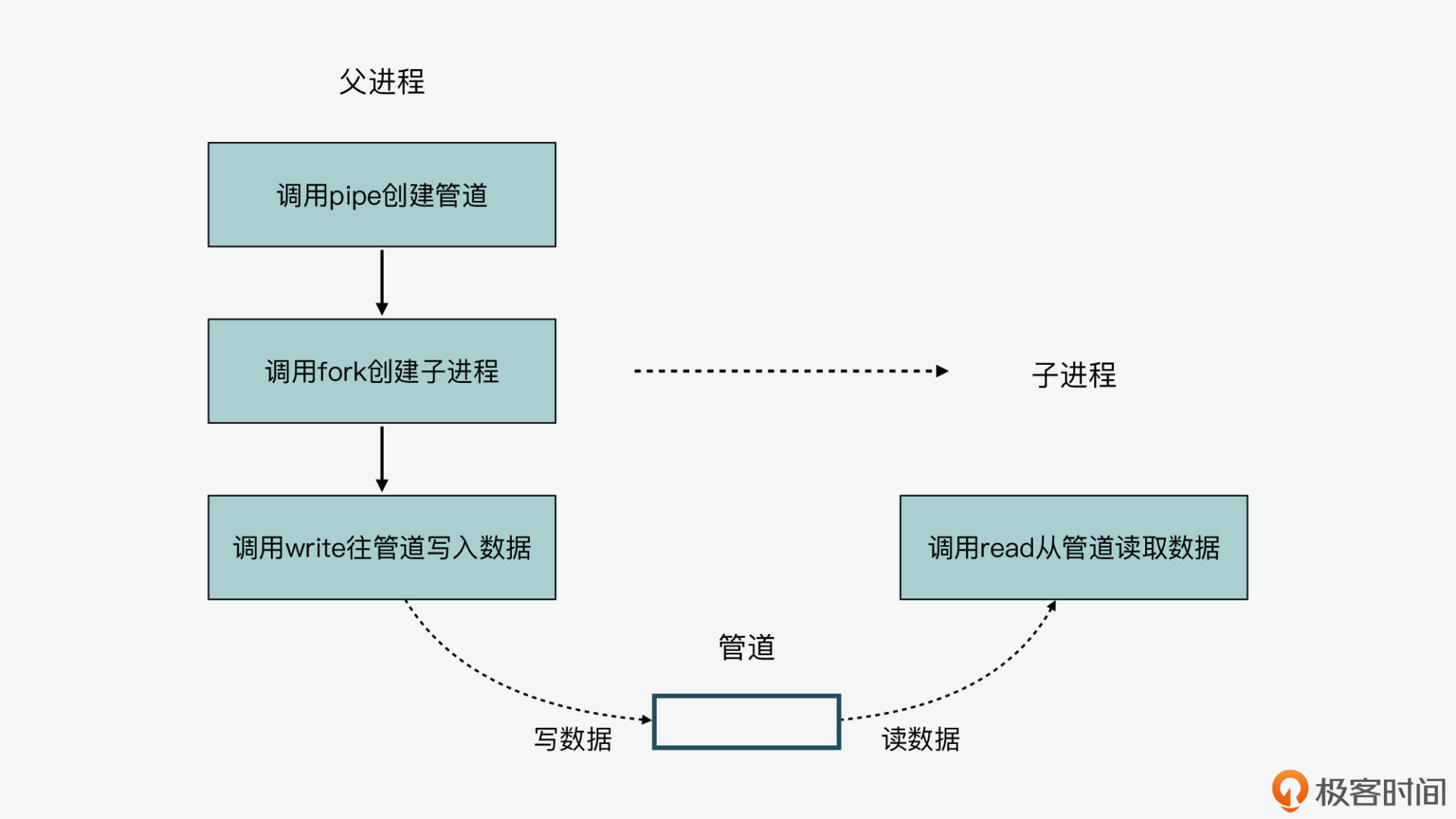 从代码中,你可以看到,在父子进程进行管道通信前,我们需要在代码中定义用于保存读写描述符的数组fd,然后调用pipe系统创建管道,并把数组fd作为参数传给pipe函数。紧接着,在父进程的代码中,父进程会调用write函数往管道文件描述符fd[1]中写入数据,另一方面,子进程调用read函数从管道文件描述符fd[0]中读取数据。