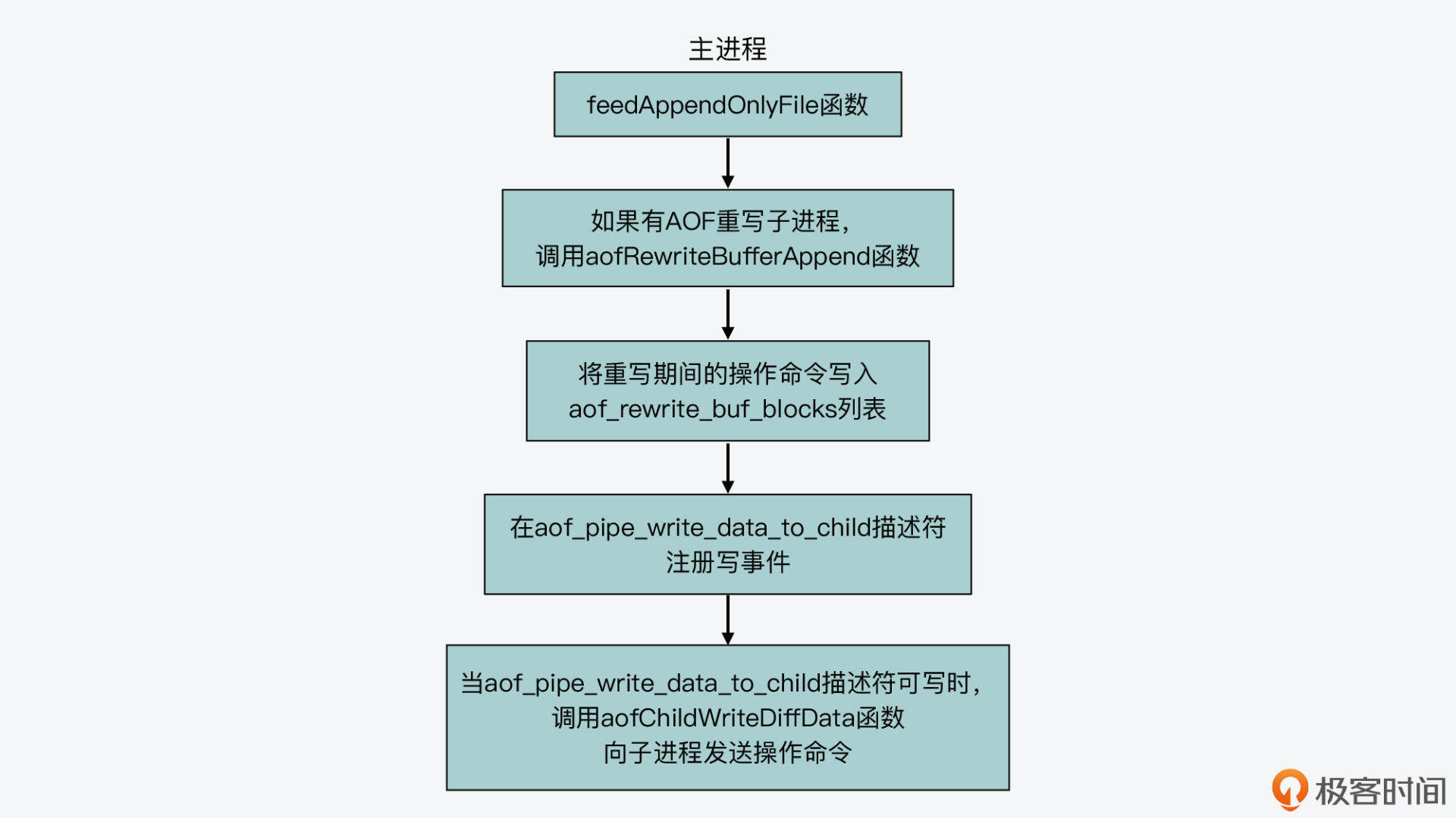 好了,这样一来,你就了解了主进程其实是在正常记录AOF日志时,将收到的命令操作写入aof_rewrite_buf_blocks列表中的数据块,然后再通过aofChildWriteDiffData函数将记录的命令操作通过主进程和重写子进程间的管道发给子进程。