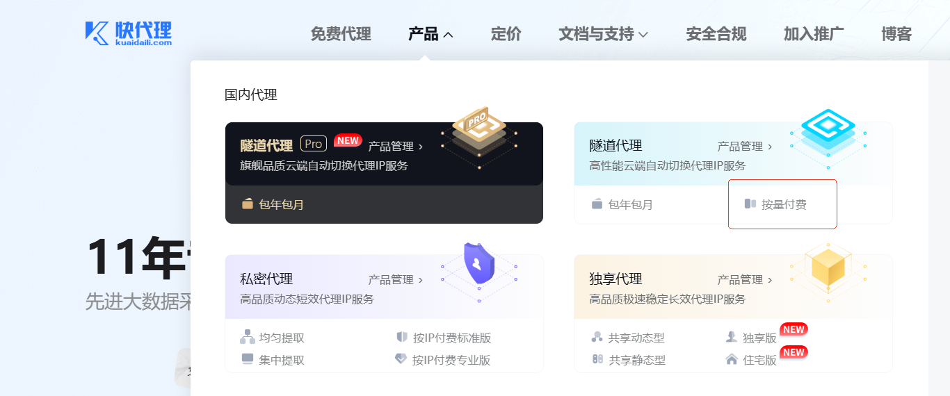 我们打开网站后,先注册并实名认证一下。然后选择产品–>隧道代理–>按量付费。