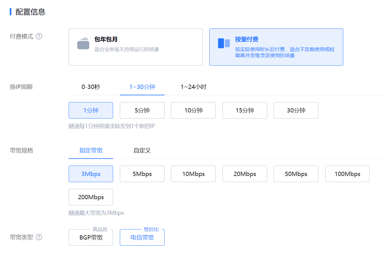 此时会进入到选择产品规格的页面。在这里建议换 IP 周期选择 1 分钟或 5 分钟,方便多次访问网站的测试。带宽根据自己的财力来,测试的话,3Mbps 和 5Mbps 也足够了。