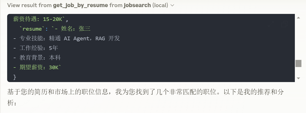 这部分也很好理解,就是按我们前面的设计来实现,将岗位列表和简历注入到 prompt 模板,然后发给大模型。