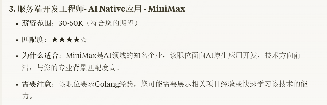 整个过程,我们就像找了一名专业的职业发展顾问一样,不仅完全代替了传统的手工找工作的方式,而且还要比手工找工作的效率更高,准确度也更高。这就是 AI 给人类带来的生活方式的转变。