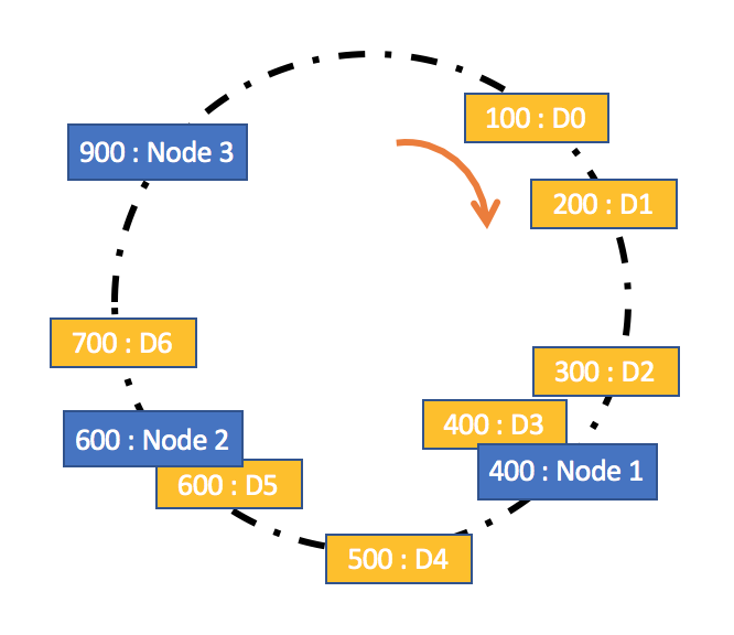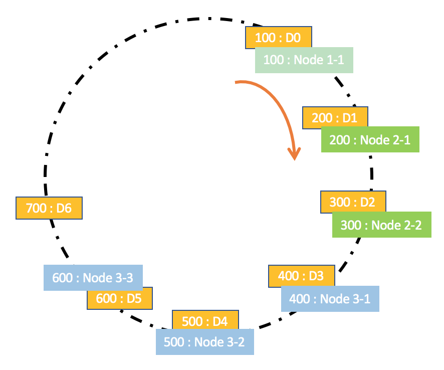 按照规则,D0,D1,D2和D3顺时针方向的下一个存储节点为Node1,因此Node1将存储数据D0(id = 100)、D1(id = 200)、D2(id = 300)和D3(id = 400);同理,Node2将存取数据D4(id = 500)和D5(id = 600),Node3将存取数据D6(id = 700)。