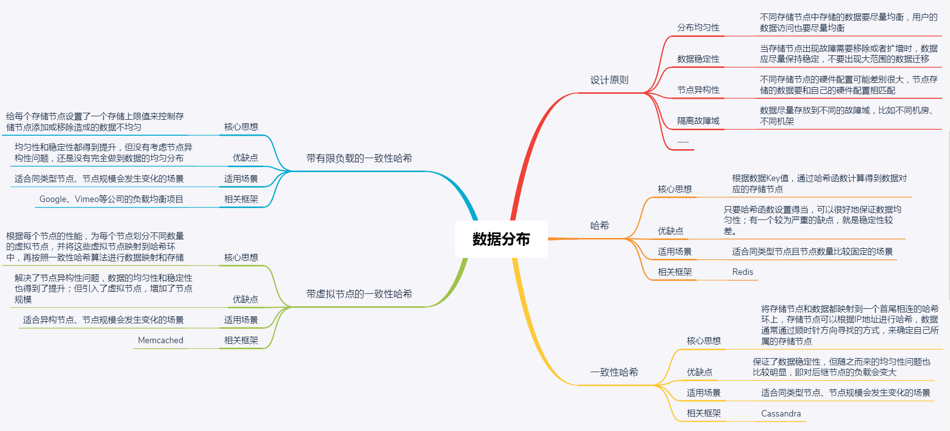其次,基于数据分布设计原则,我为你介绍了哈希、一致性哈希、带有限负载的一致性哈希和带虚拟节点的一致性哈希方法,并以例子进行辅助讲解,以便于你理解和学习。